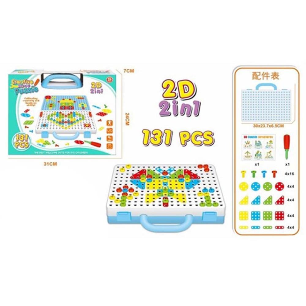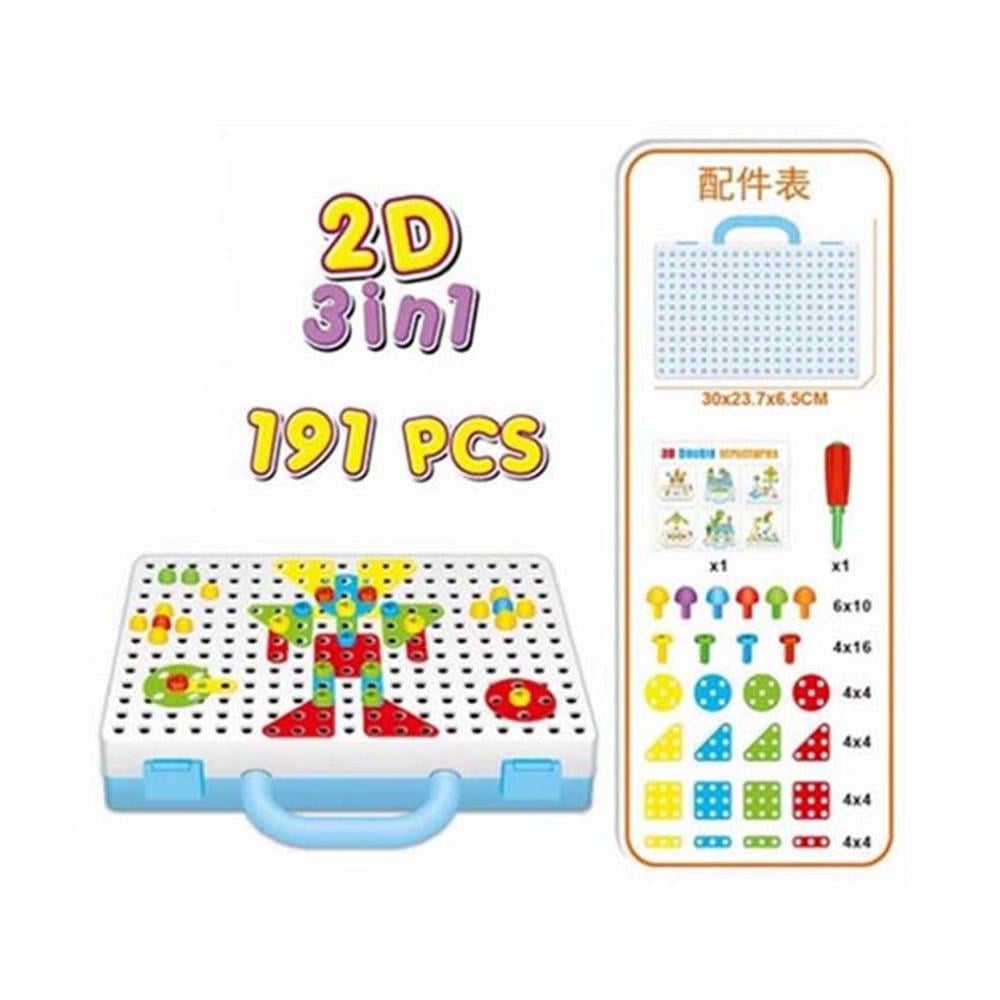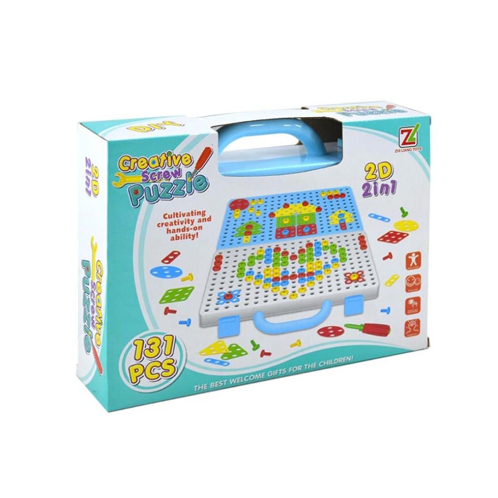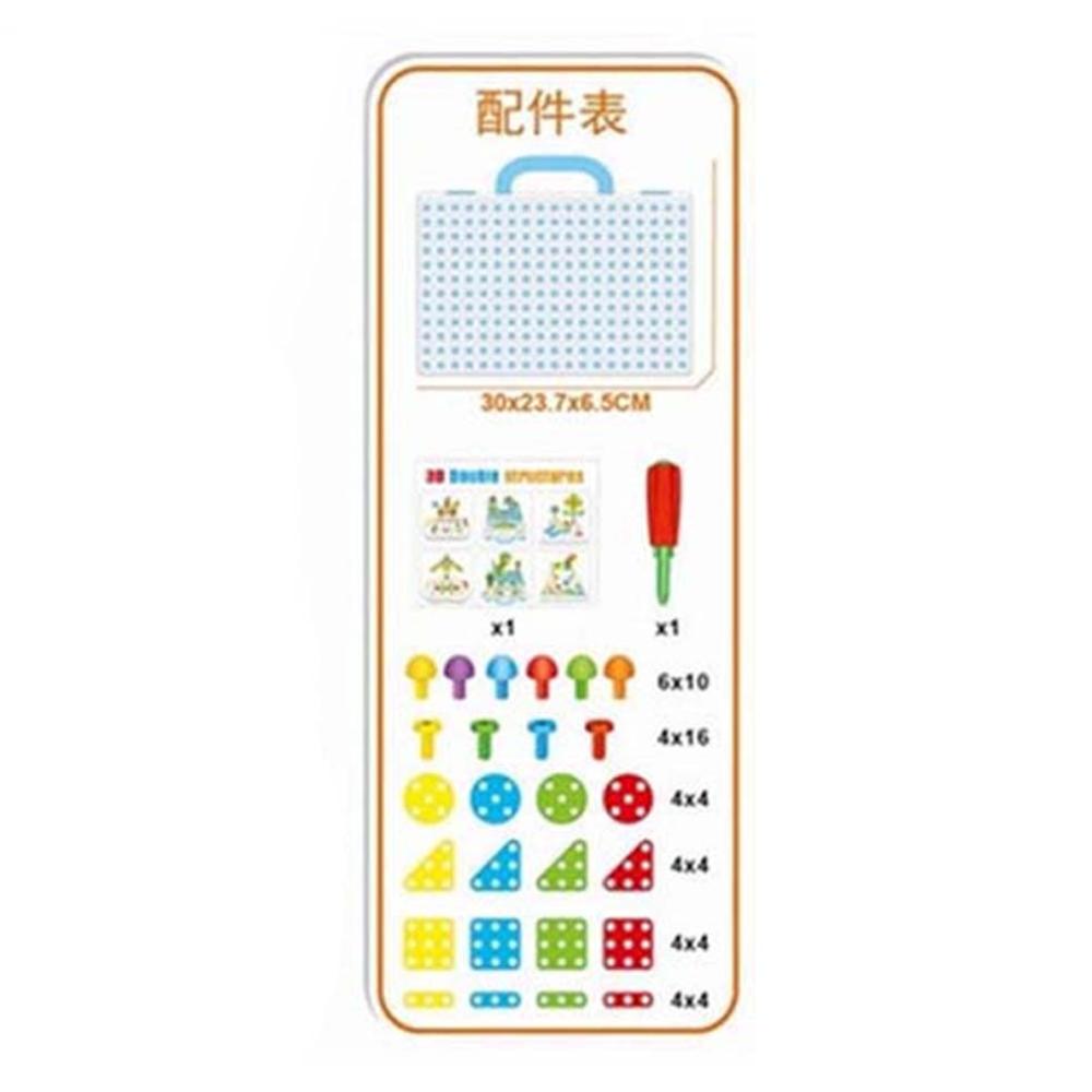 تتضمن لوحًا رئيسيًا، ومفكًا، وأشكالًا متنوعة من المسامير البلاستيكية الملونة