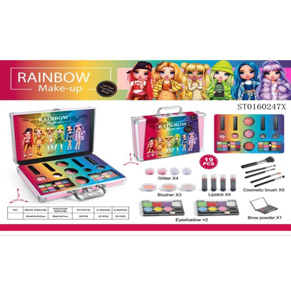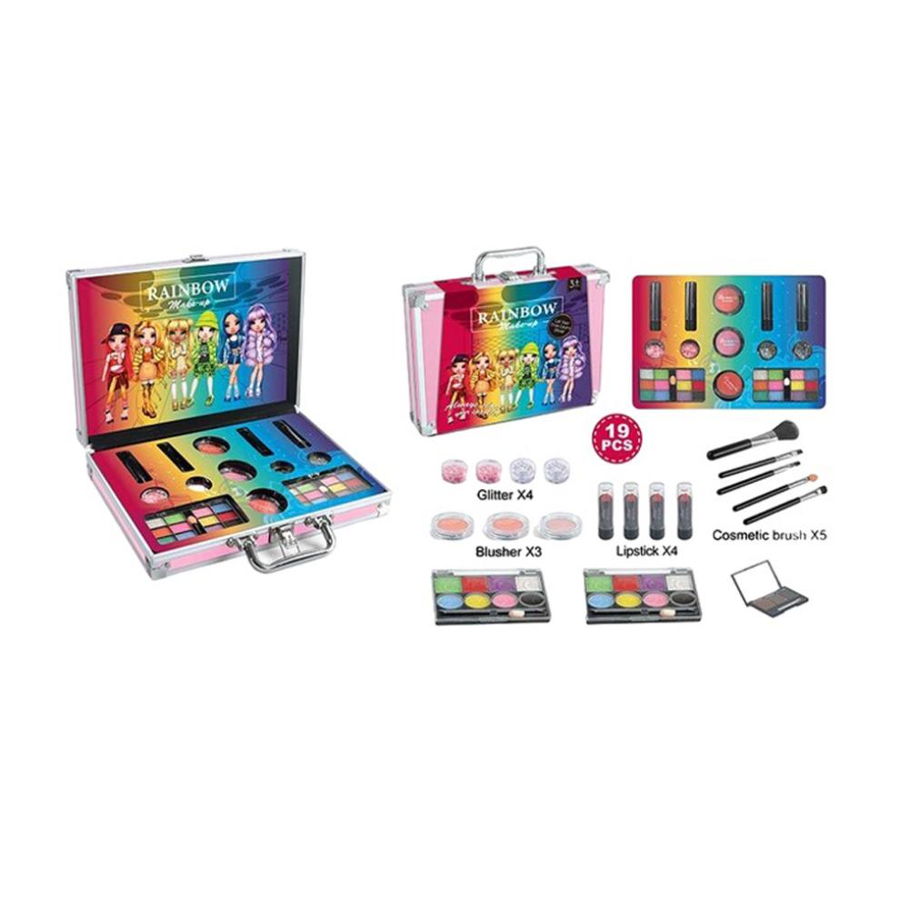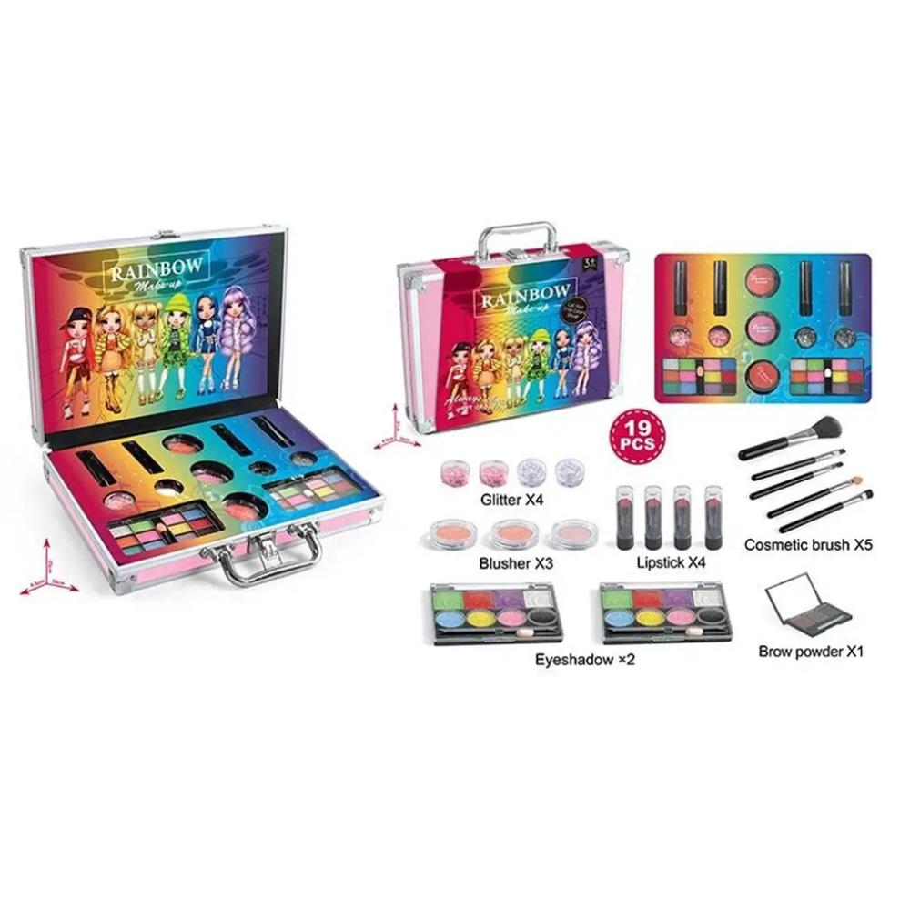 لمحبي المكياج ، هذه الحقيبة مثالية ، مما سيسمح لك بإنشاء أفضل صورة بمساعدة مستحضرات التجميل الزخرفية. في المجموعة ، يمكنك العثور على أحمر الشفاه ، ولوحات ظلال العيون ، واللمعان المتنوع ، وأحمر الخدود ، ولوحة الكنتور ، ومجموعة من الفرش - كل ما قد يحتاجه فنان المكياج الصغير. الحقيبة المريحة مفيدة ليس فقط لتخزين جميع المنتجات ، ولكن أيضا لأخذ مستحضرات التجميل معك. ستساعد مستحضرات التجميل طفلك على تطوير الإبداع والمهارات الحركية لليد والاستمتاع!