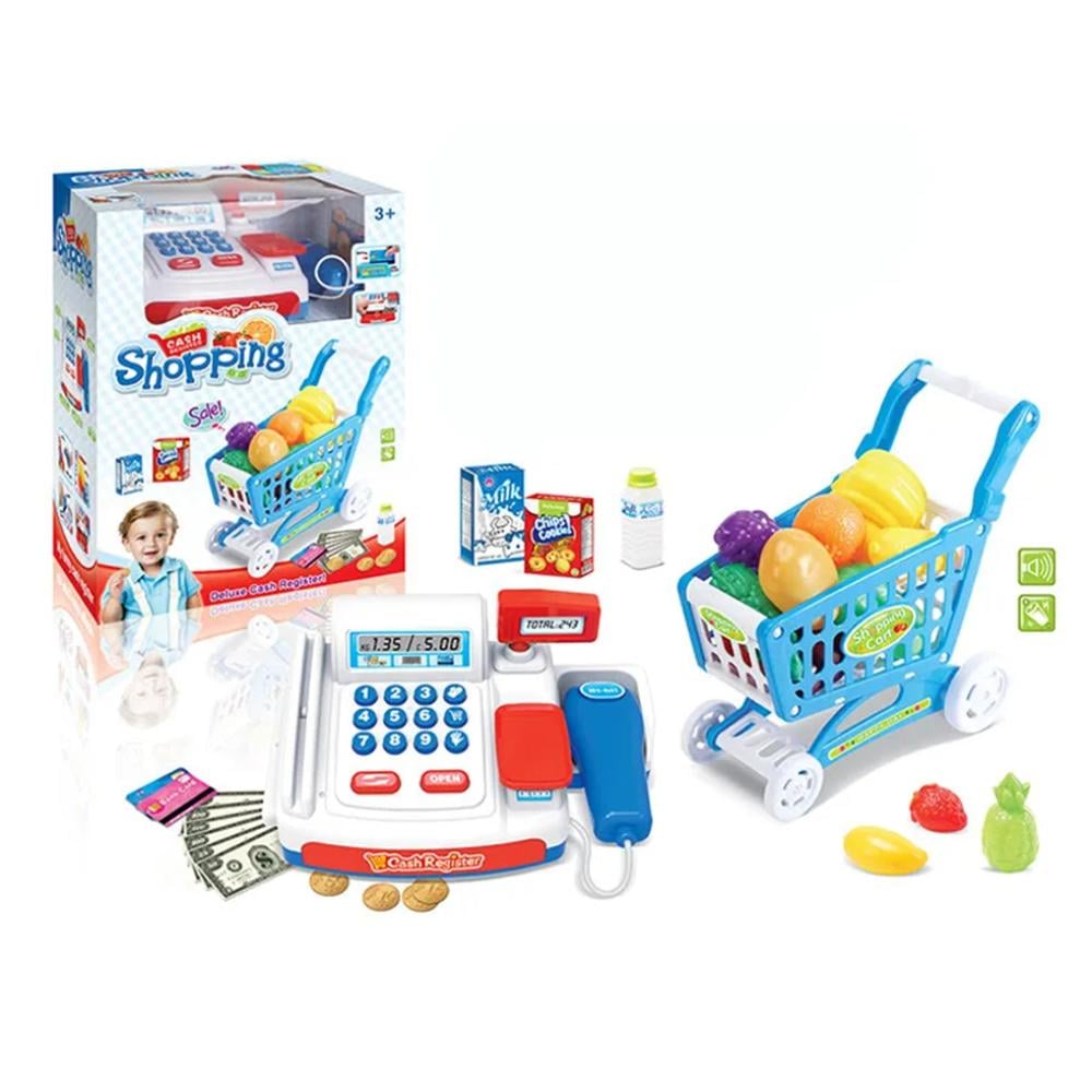 وعربة تسوق وفواتير ألعاب وعملات معدنية ومجموعة متنوعة من منتجات الألعاب.