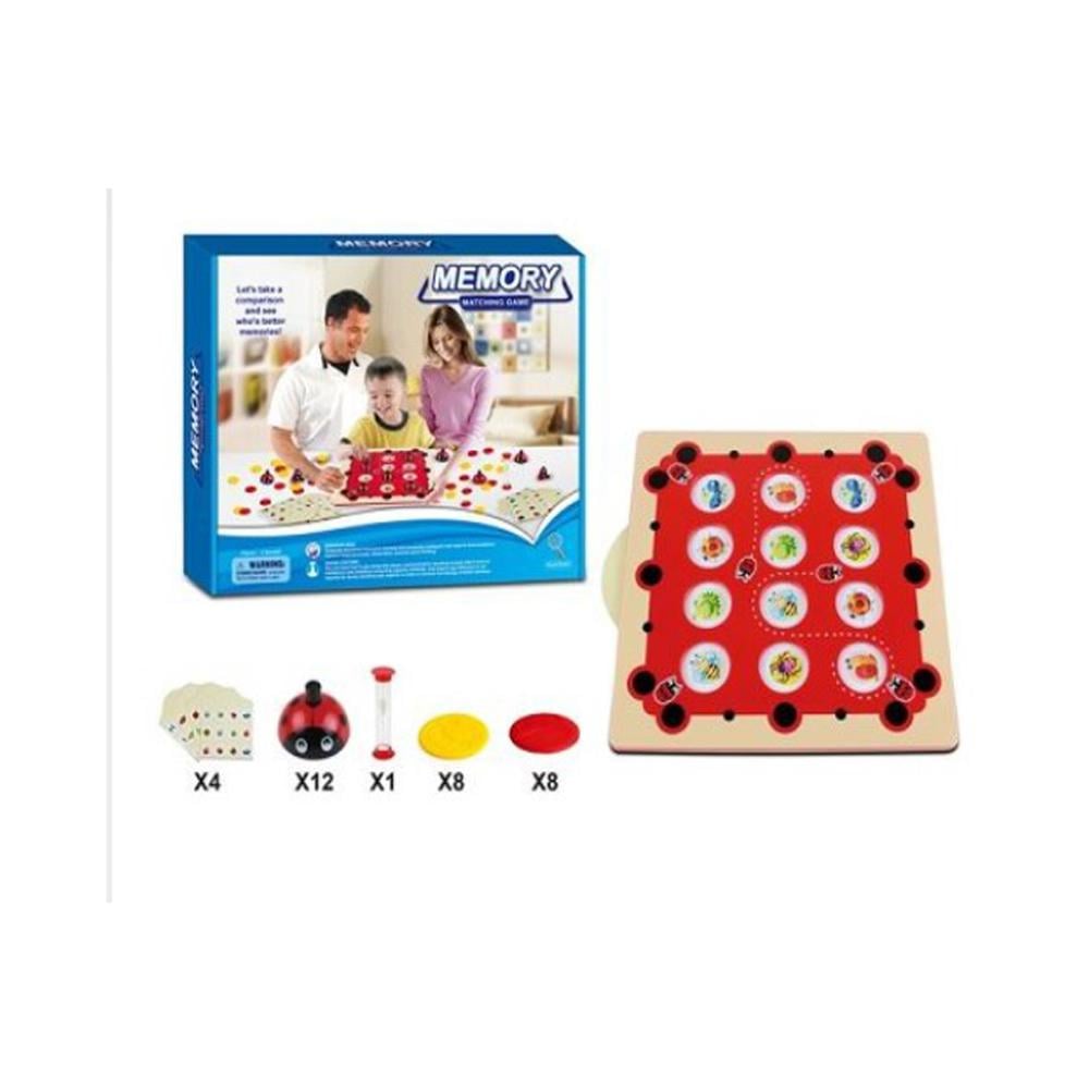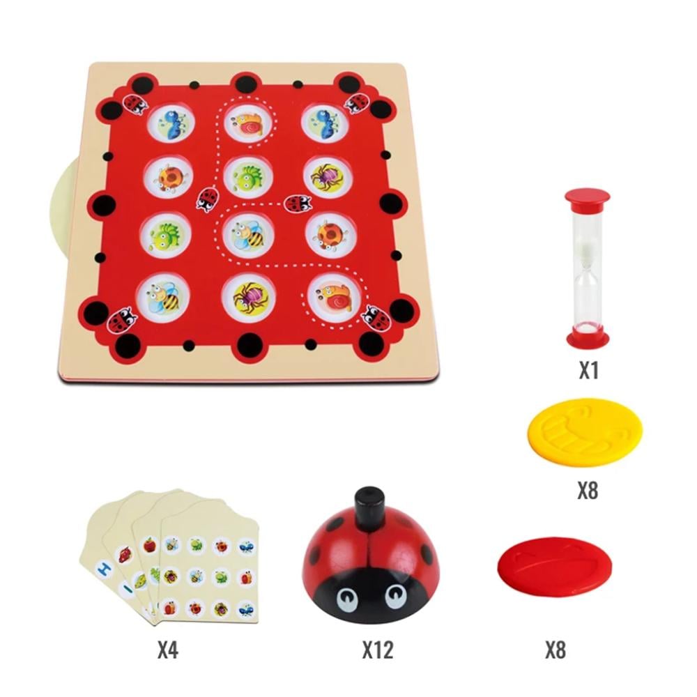 لوحة لعب واحدة، بطاقات تخمين مزدوجة الجوانب *4، خنافس *12، ساعة رملية *1، عملات صفراء *8، عملات حمراء *8. دعونا نجري مقارنة ونرى من لديه ذاكرة أفضل!