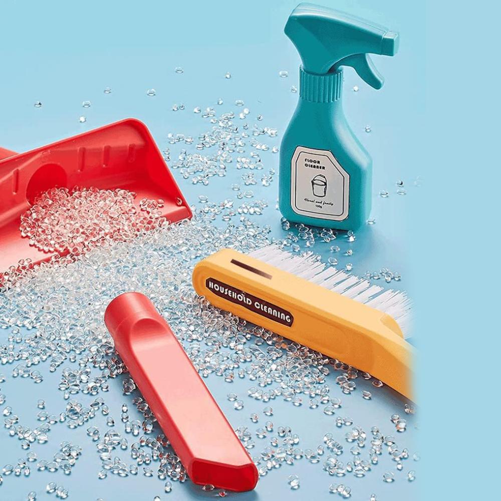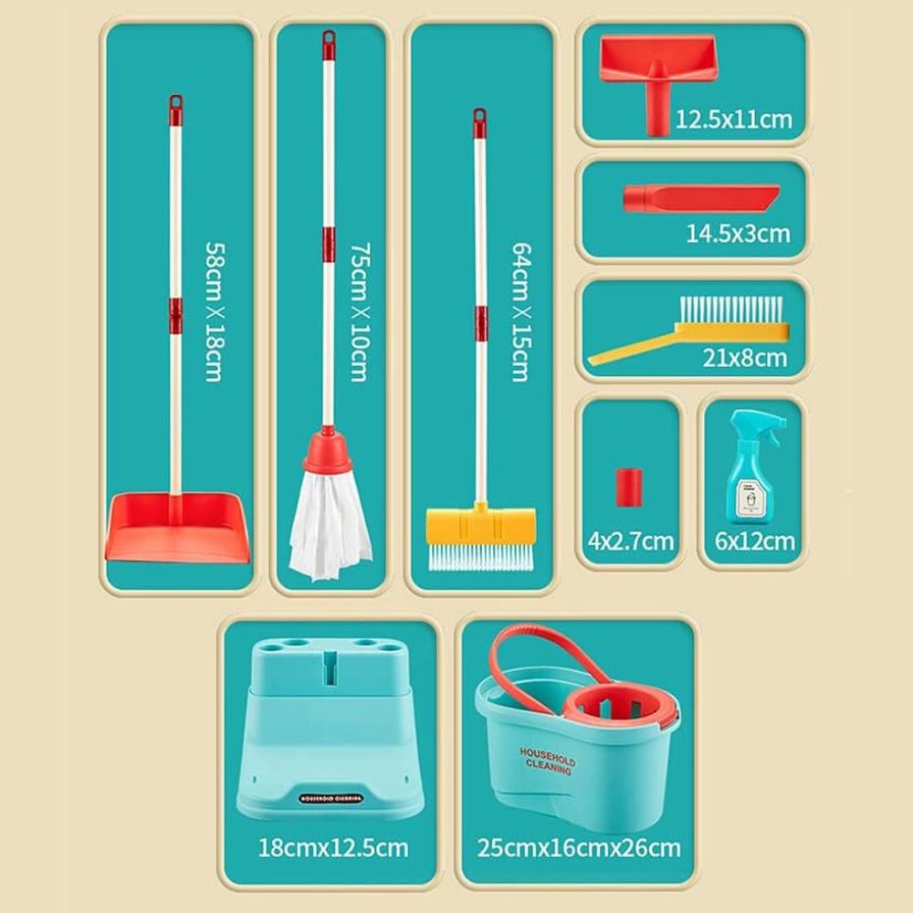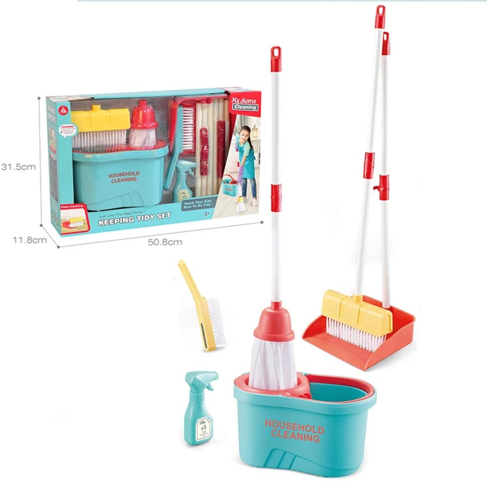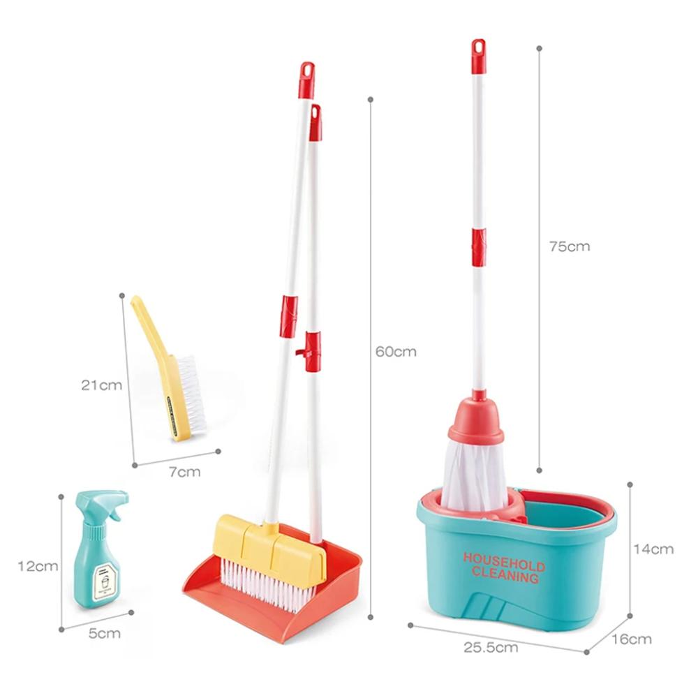 تتضمن هذه المجموعة الواقعية للتنظيف مكنسة، ومجرفة غبار، ودلو، وزجاجة رش، وممسحة، مما