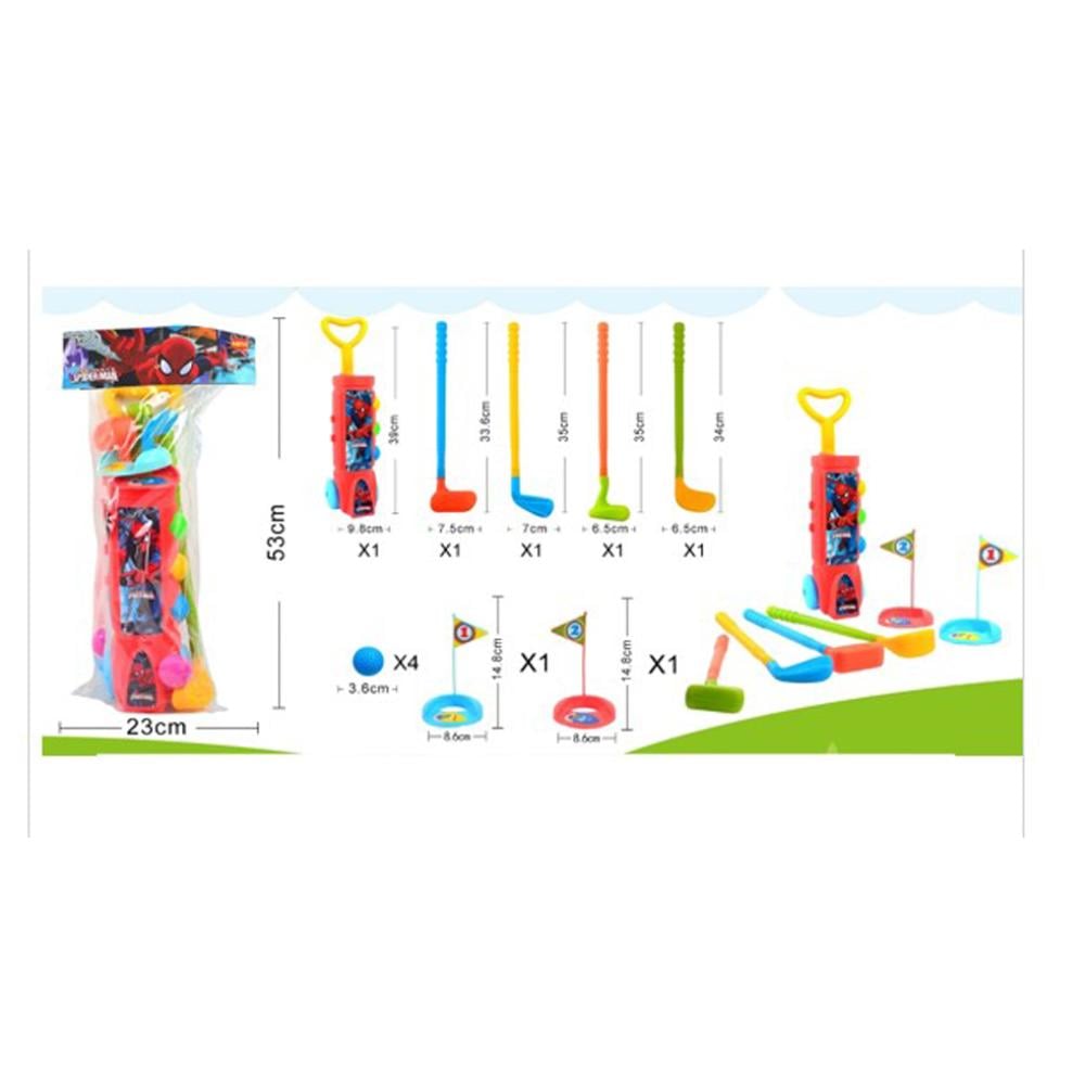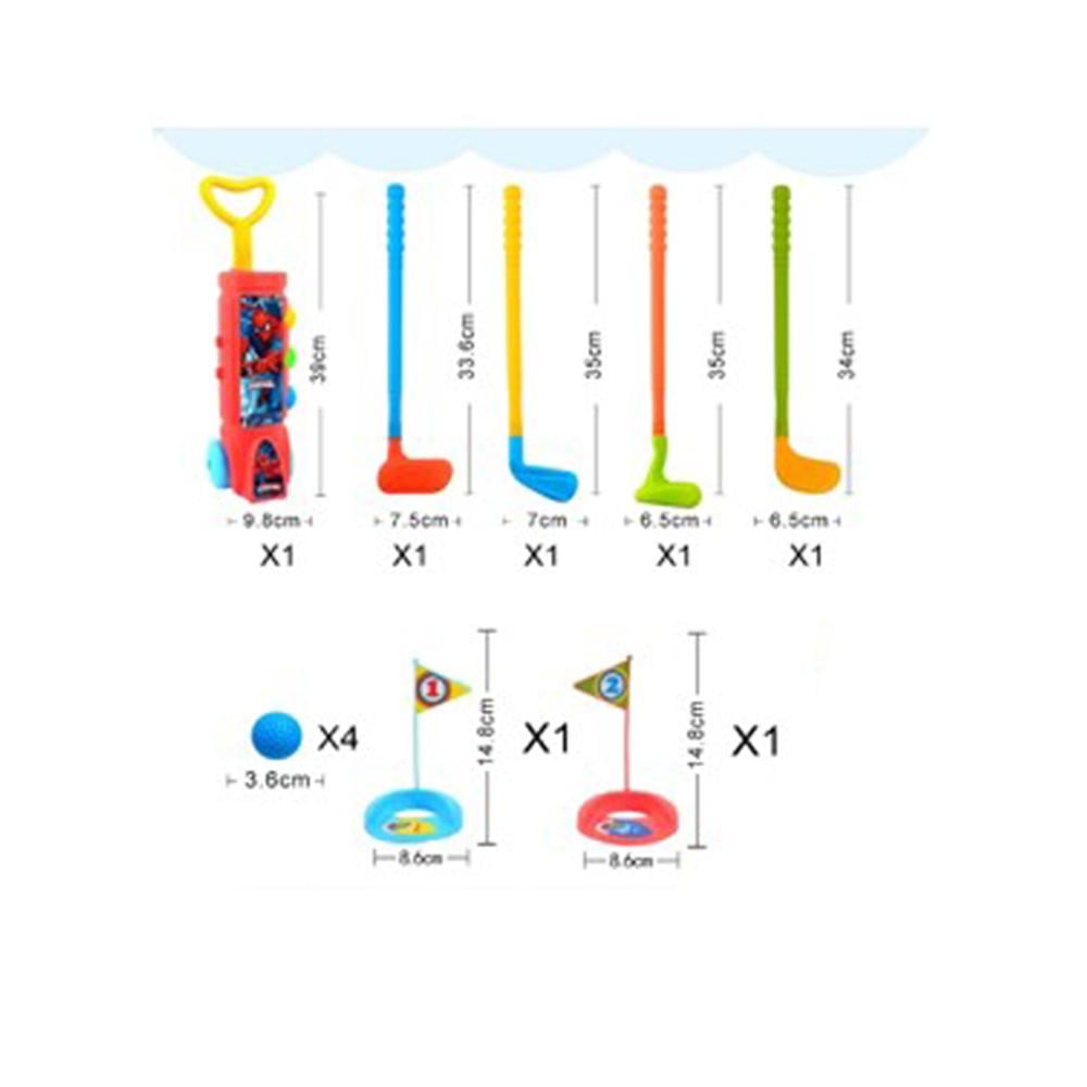 - تتضمن المجموعة عربة جولف بعجلات، وعصي جولف بألوان مختلفة، وكرات جولف، وأعلام، وثقوب جولف.