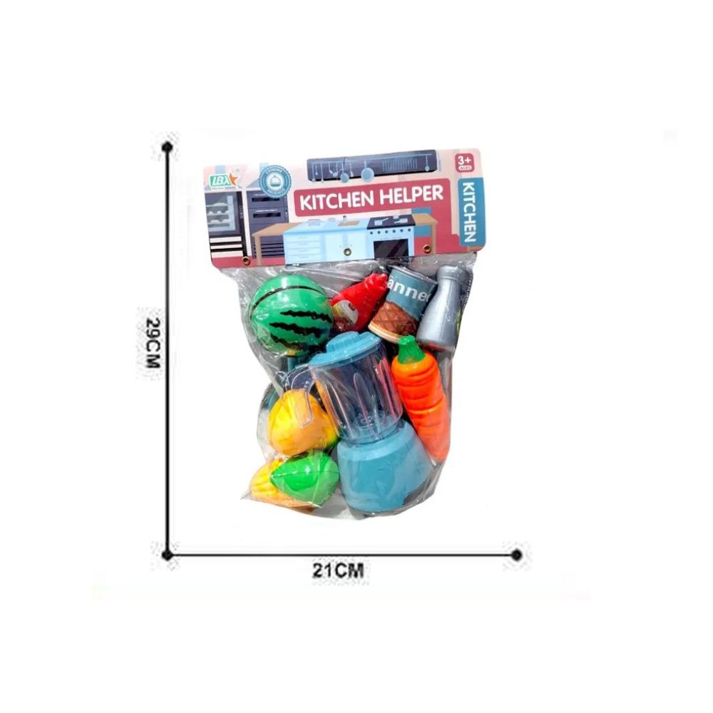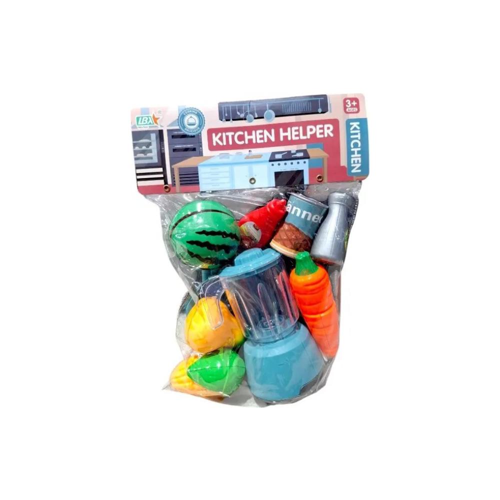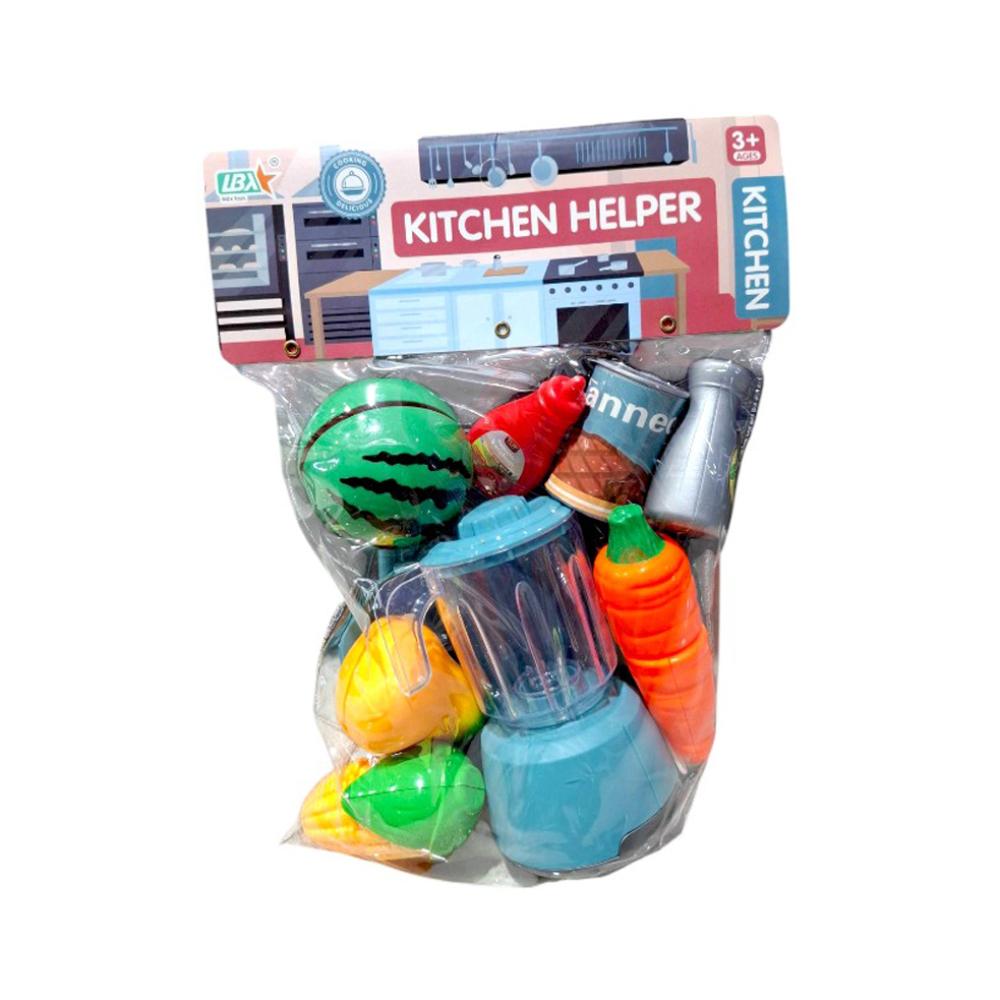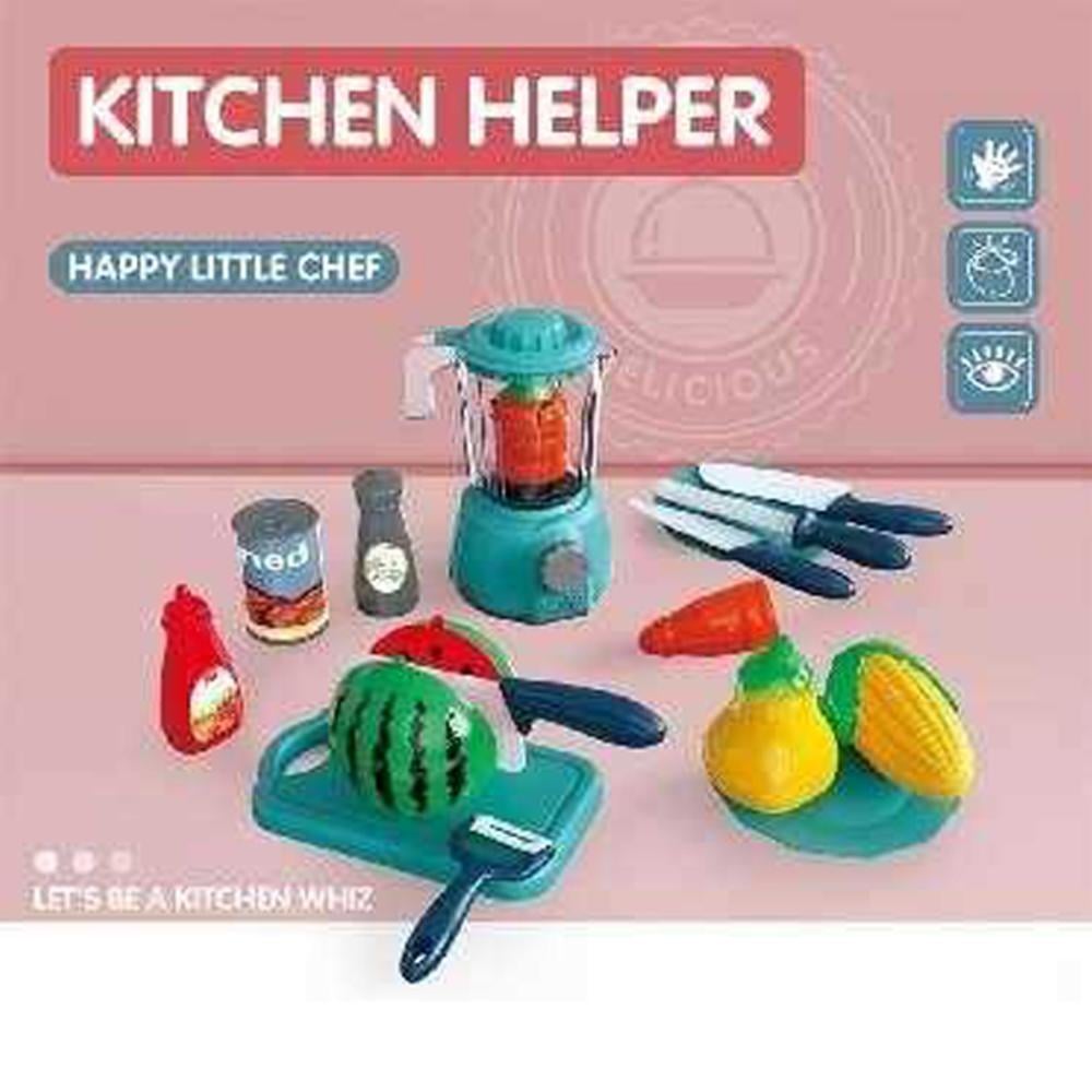 طقم مطبخ للأطفال مع خلاط وإكسسوارات وأواني وأطعمة ألعاب بتصميم ملون مشرق.
