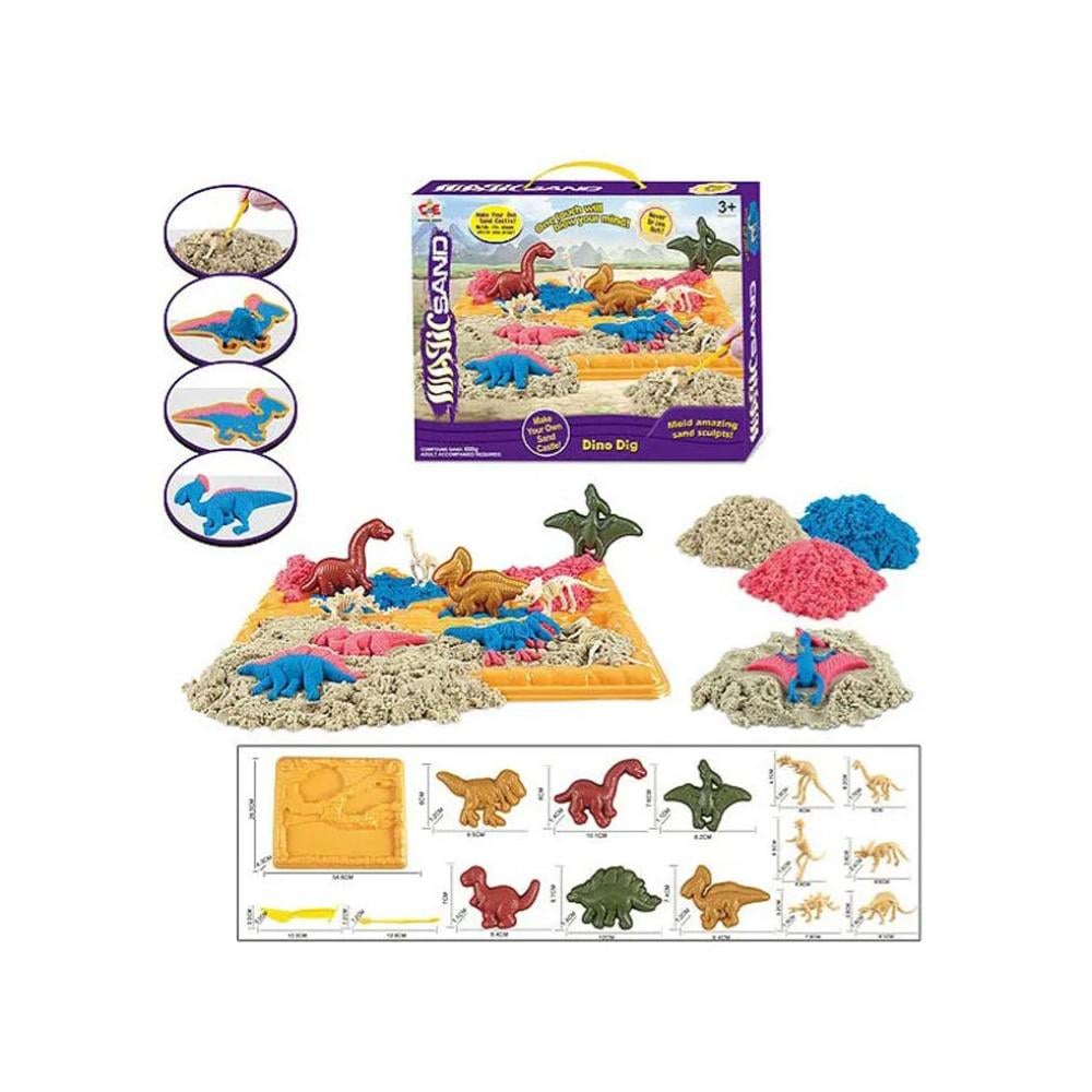 لن توفر هذه اللعبة الرائعة الكثير من المرح والمتعة فحسب، بل ستدعم أيضًا نمو طفلك على العديد من المستويات. دع طفلك يكتشف عالم الديناصورات الرائع ويتطور من خلال الإبداع والابتكار. تتضمن المجموعة: - 3 أكياس رمل باللون البيج والأرجواني والأزرق - 6 قوالب ديناصورات - 6 هياكل عظمية للديناصورات - لوحة بها تجاويف - 2 ملحقات صب - رقاقة معدنية أبعاد العبوة: 35 سم × 28 سم × 6 سم . مخصص للأطفال فوق 3 سنوات من العمر.